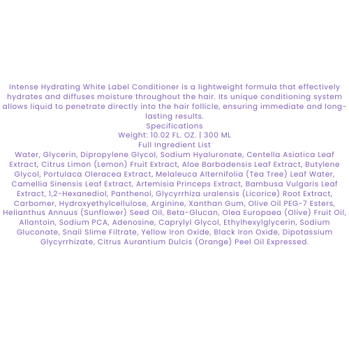 Intense Hydrating White Label Conditioner is a lightweight formula that effectively hydrates and diffuses moisture throughout the hair. Its unique conditioning system allows liquid to penetrate directly into the hair follicle, ensuring immediate and long-lasting results.